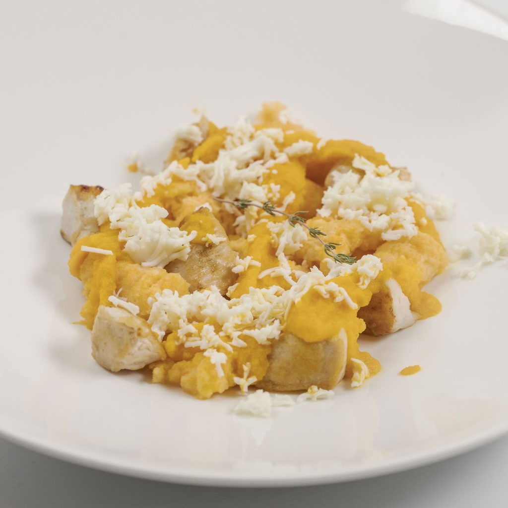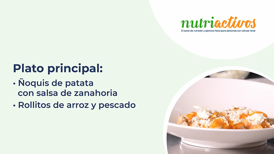 Plato principal: Ñoquis de patata con salsa de zanahoria y Rollitos de arroz y pescado