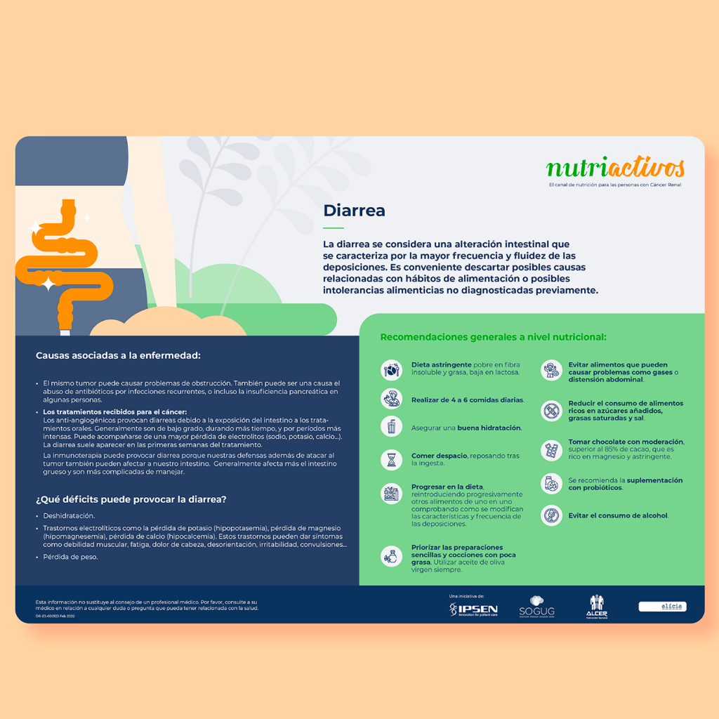 La diarrea es frecuente en personas con cáncer renal que reciben tratamiento, teniendo un claro impacto en la calidad de vida. En algunos casos puede ser debida a complicaciones de la enfermedad o como consecuencia del tratamiento. Este vídeo describe de forma detallada cómo adaptar la alimentación en caso de diarrea.