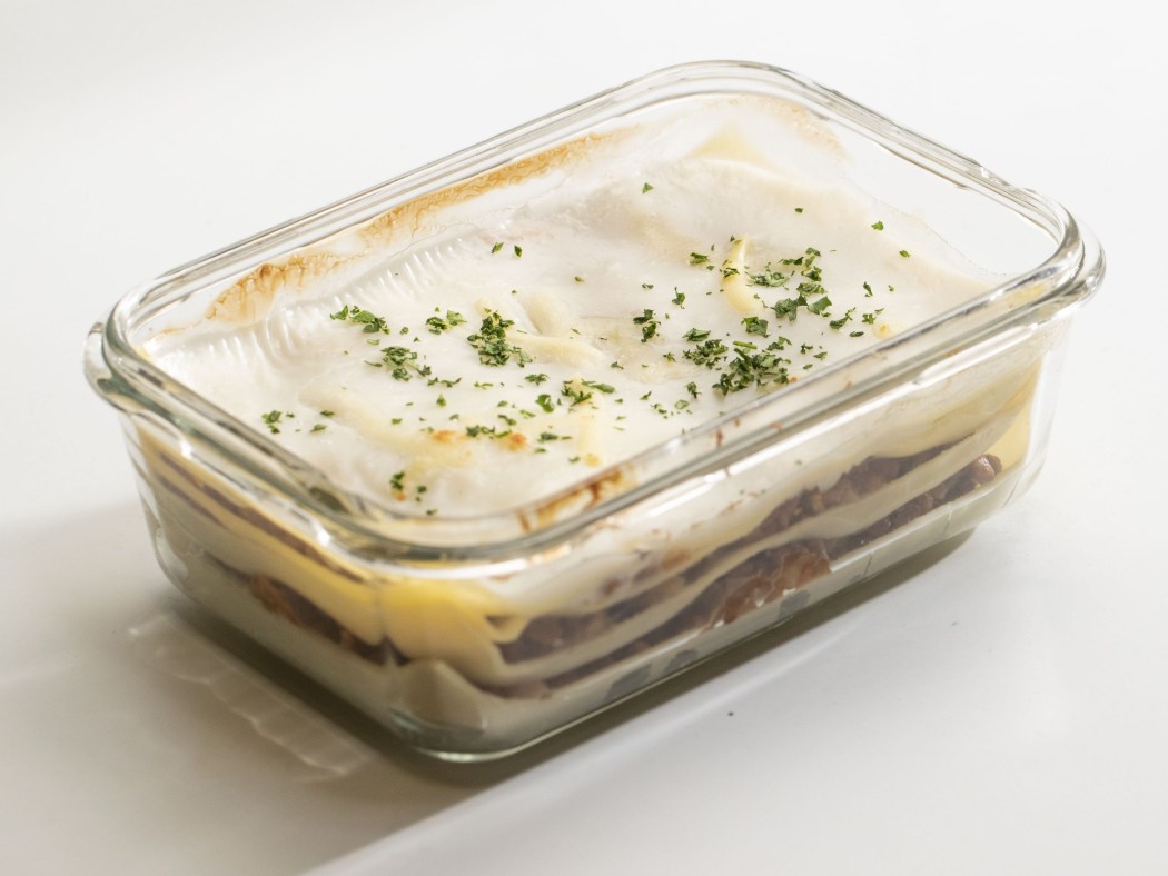 - Para montar la lasaña; colocar unas gotas de aceite en una bandeja de horno e intercalar las láminas de pasta con el relleno. Terminar con una capa de bechamel y un poco de pan rallado por encima.
