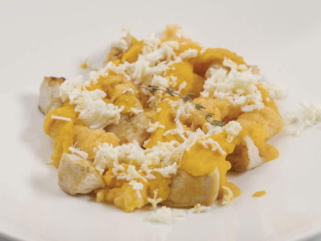 - Dorar el pollo en una sartén con un hilo de aceite. Rallar la clara de huevo duro. Servir con la salsa en la base de un plato y los ñoquis con un hilo de aceite de oliva por encima. Acompañar con el pollo y la clara para incrementar el aporte proteico de la elaboración.