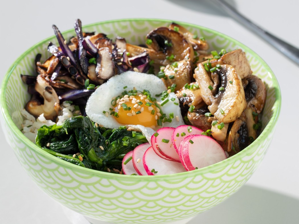 - Disponer el arroz en la base de un bol y las verduras y las setas alrededor, separadas entre sí.
