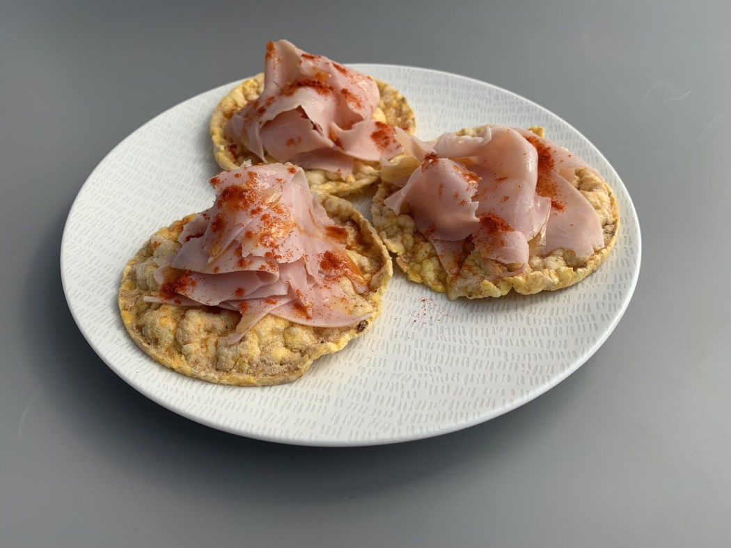 - Disponer las lonchas de jamón cocido sobre las tortitas de arroz con un chorrito de aceite de oliva y una pizca de pimentón dulce por encima.